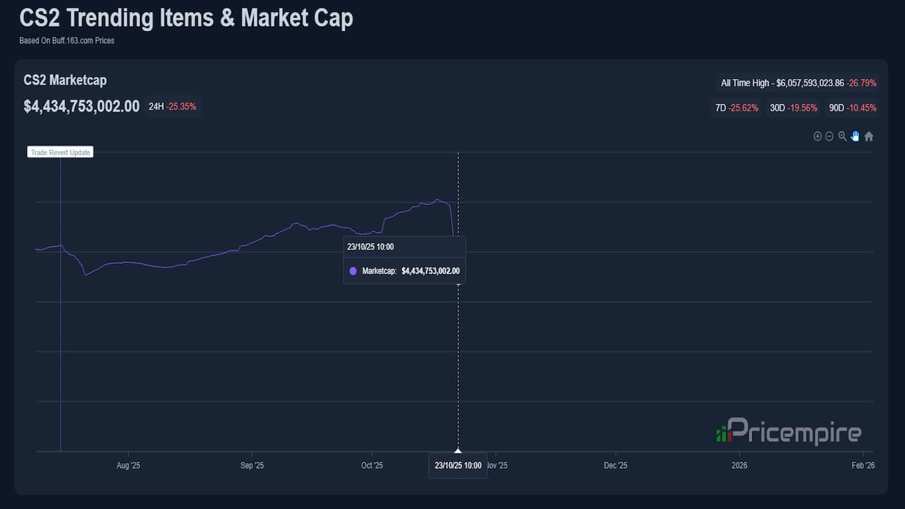 The Counter-Strike 2 (CS2) skins market, often described as a digital commodities exchange for gamers, just witnessed one of its worst crashes in history. Within hours of Valve’s latest update, an estimated $1.7 to $2 billion in market value was erased which means a 30–36% decline from a roughly $6 billion capitalization to about $4–4.6 billion.